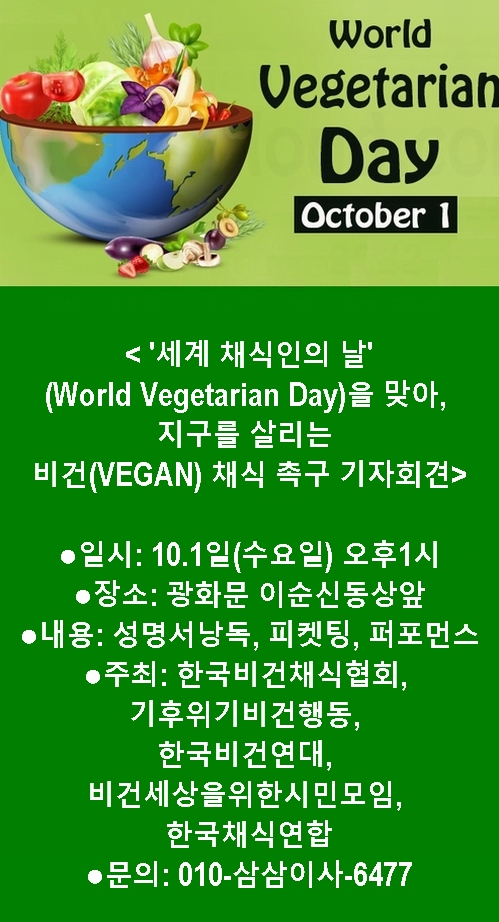 <10¿ù 1ÀÏ(¼ö) '¼¼°è ä½ÄÀÎÀÇ ³¯'(World Vegetarian Day)À» ¸Â¾Æ, Áö±¸¸¦ »ì¸®´Â ºñ°Ç(VEGAN) ä½Ä Ã˱¸ ±âÀÚȸ°ß>