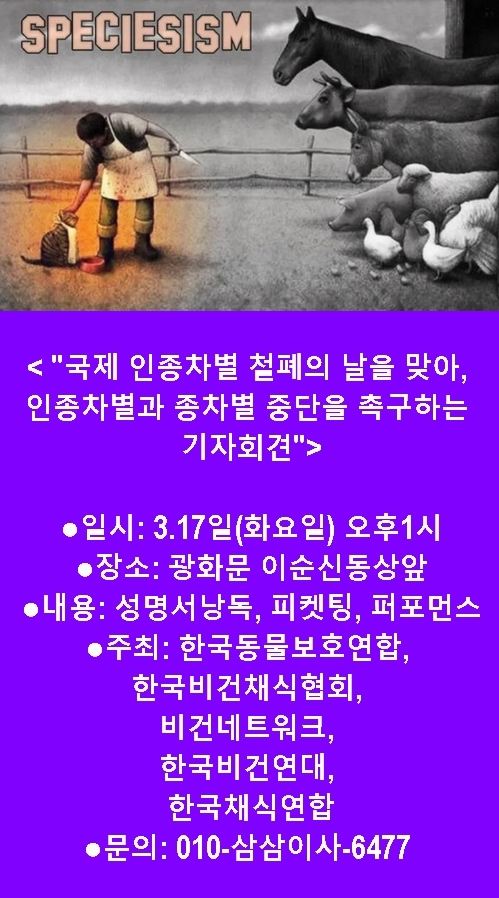 '±¹Á¦ ÀÎÁ¾ Â÷º° öÆóÀÇ ³¯'À» ¸Â¾Æ, ÀÎÁ¾Â÷º°À» ÇÏ·ç »¡¸® û»êÇÒ °ÍÀ» Ã˱¸Çϸç, ¾Æ¿ï·¯ 'Á¾(ðú) Â÷º°ÁÖÀÇ'(Speciesism) ÆóÁö¸¦ Ã˱¸ÇÑ´Ù.