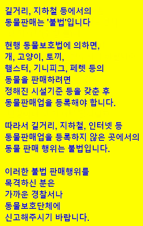 µû¶ó¼ ±æ°Å¸®, ÁöÇÏö, ÀÎÅÍ³Ý µî µ¿¹°ÆÇ¸Å¾÷À» µî·ÏÇÏÁö ¾ÊÀº °÷¿¡¼ÀÇ µ¿¹° ÆÇ¸Å ÇàÀ§´Â ºÒ¹ýÀÔ´Ï´Ù.
