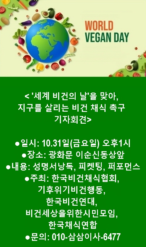 | [º¸µµÀÚ·á] 10.31ÀÏ(±Ý), 11¿ù 1ÀÏ '¼¼°è ºñ°ÇÀÇ ³¯'(World Vegan Day)À» ¸Â¾Æ, Áö±¸¸¦ »ì¸®´Â ºñ°Ç ä½Ä Ã˱¸ ±âÀÚȸ°ß |