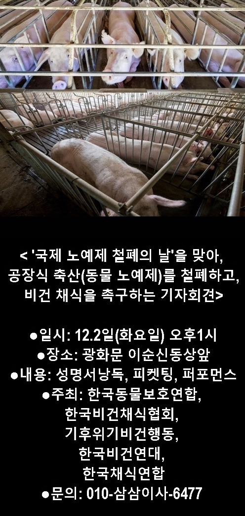 | 12.2ÀÏ(È) '±¹Á¦ ³ë¿¹Á¦ öÆóÀÇ ³¯'À» ¸Â¾Æ, °øÀå½Ä Ãà»ê(µ¿¹° ³ë¿¹Á¦)¸¦ öÆóÇϰí, ºñ°Ç ä½ÄÀ» Ã˱¸ÇÏ´Â ±âÀÚȸ°ß |