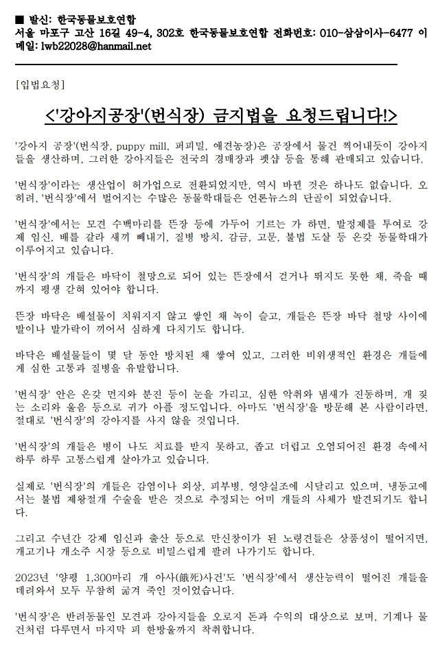 Çѱ¹µ¿¹°º¸È£¿¬ÇÕ(Korea Association for Animal Protection) | ÀüÈ:02)707-3590 | À̸ÞÀÏÁÖ¼Ò: LWB22028@hanmail.net